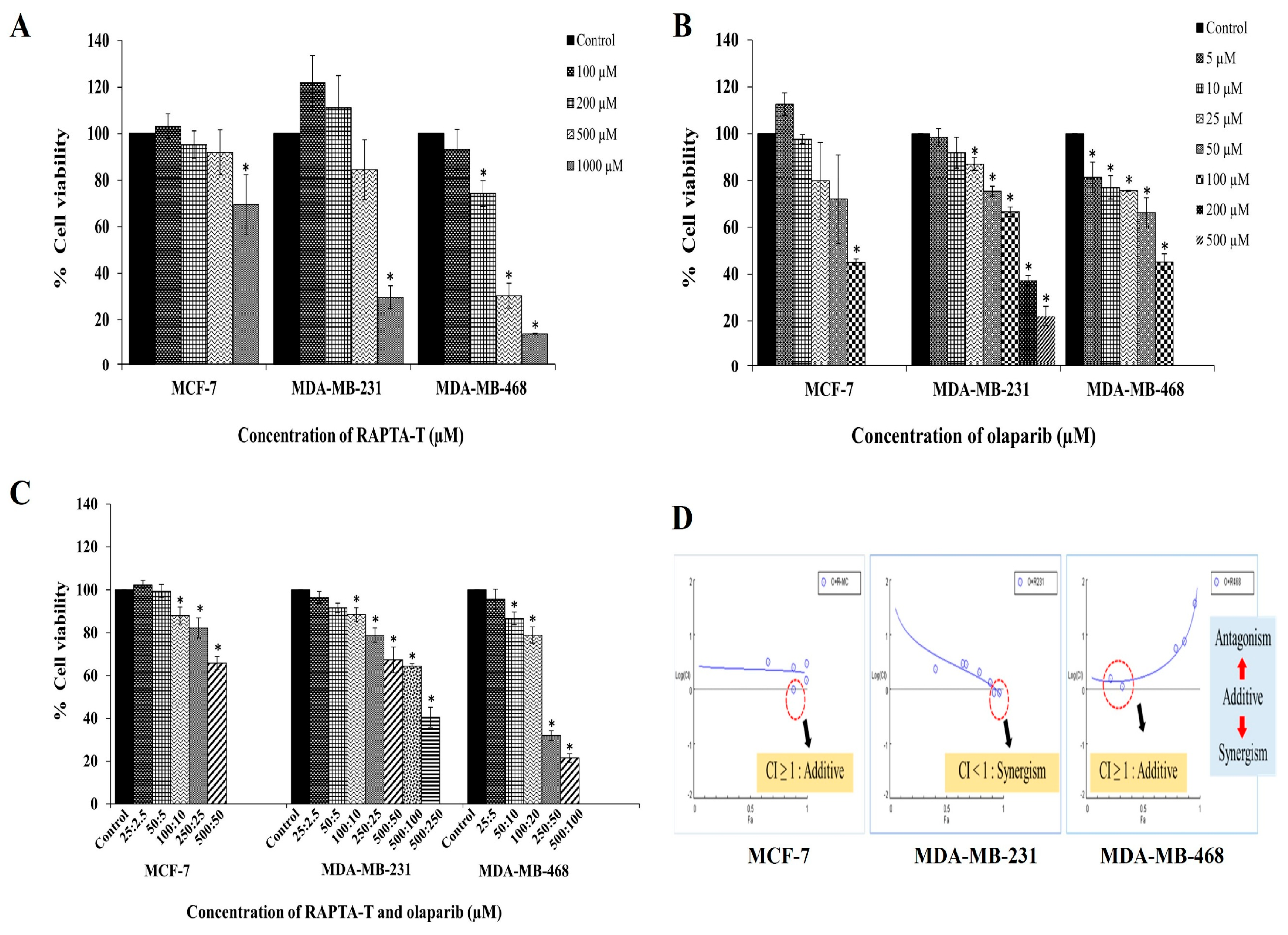 2.1. Cytotoxic Effects of RAPTA-T or Olaparib as a Single Agent and Combination Compound on Human Breast Cancer Cells