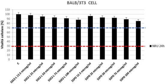 NRU assay outcomes. Percentage viability of BALB/3T3 Clone A31 fibroblasts determined using the neutral red uptake (NRU) cytotoxicity test after exposure to increasing concentrations of SSE2-L or SSPD. Data are expressed as mean ± SD from three replicate wells per group. The red dashed line indicates a strong cytotoxic effect (cell viability < 30%), whereas the blue dashed line marks the non-cytotoxic range (cell viability between 70% and 100%).