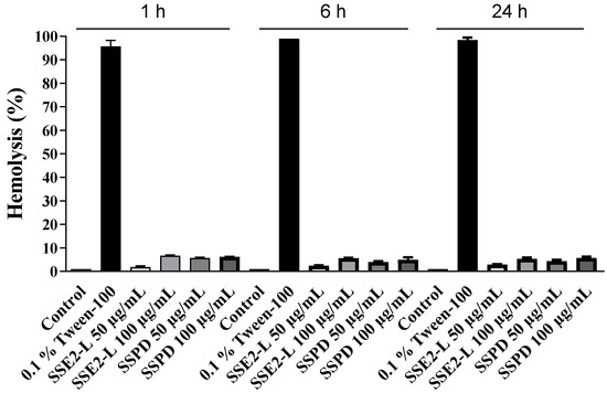 Hemolytic activity of biocompounds. Human red blood cells (RBCs) were incubated with phosphate-buffered saline (PBS; negative control), 0.1% Tween-100 (positive control), SSE2-L (50 or 100 μg/mL), or SSPD (50 or 100 μg/mL) for 1, 6, or 24 h. The histograms display the mean percentage of hemolysis relative to the positive control, obtained from three independent experiments, each conducted in triplicate. Statistical significance was determined in comparison with the 0.1% Tween-100 (positive control).