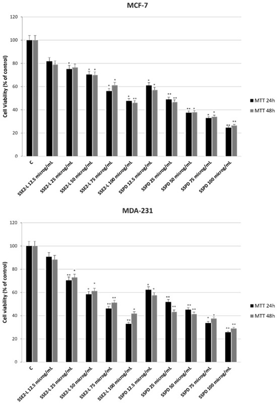 MCF-7 and MDA-231 cells were cultured in 48-well plates and exposed to the test formulations, consisting of SSE2-L and SSPD at increasing concentrations for 24 or 48 h. Following the treatment period, 200 μL of MTT solution was added to each well, and the plates were incubated for 2 h at 37 °C in a humidified environment.
