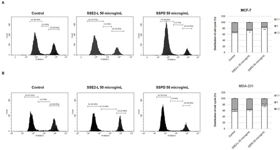 SSE2-L and SSPD effects on MCF-7 and MDA--MB 231 cell cycle population distribution. MCF-7 (A) and MDA—MB-231 (B) cells were left untreated (basal) or treated with SSE2-L or SPD for 24 h at 50 μg/mL. Cell cycle distribution was analyzed by flow cytometry following nuclear PI staining. The graphs on the right depict the percentage of MCF-7 and MDA-MB-231 cells within the different cell cycle phases. (* p < 0.05; ** p < 0.01 vs. basal).