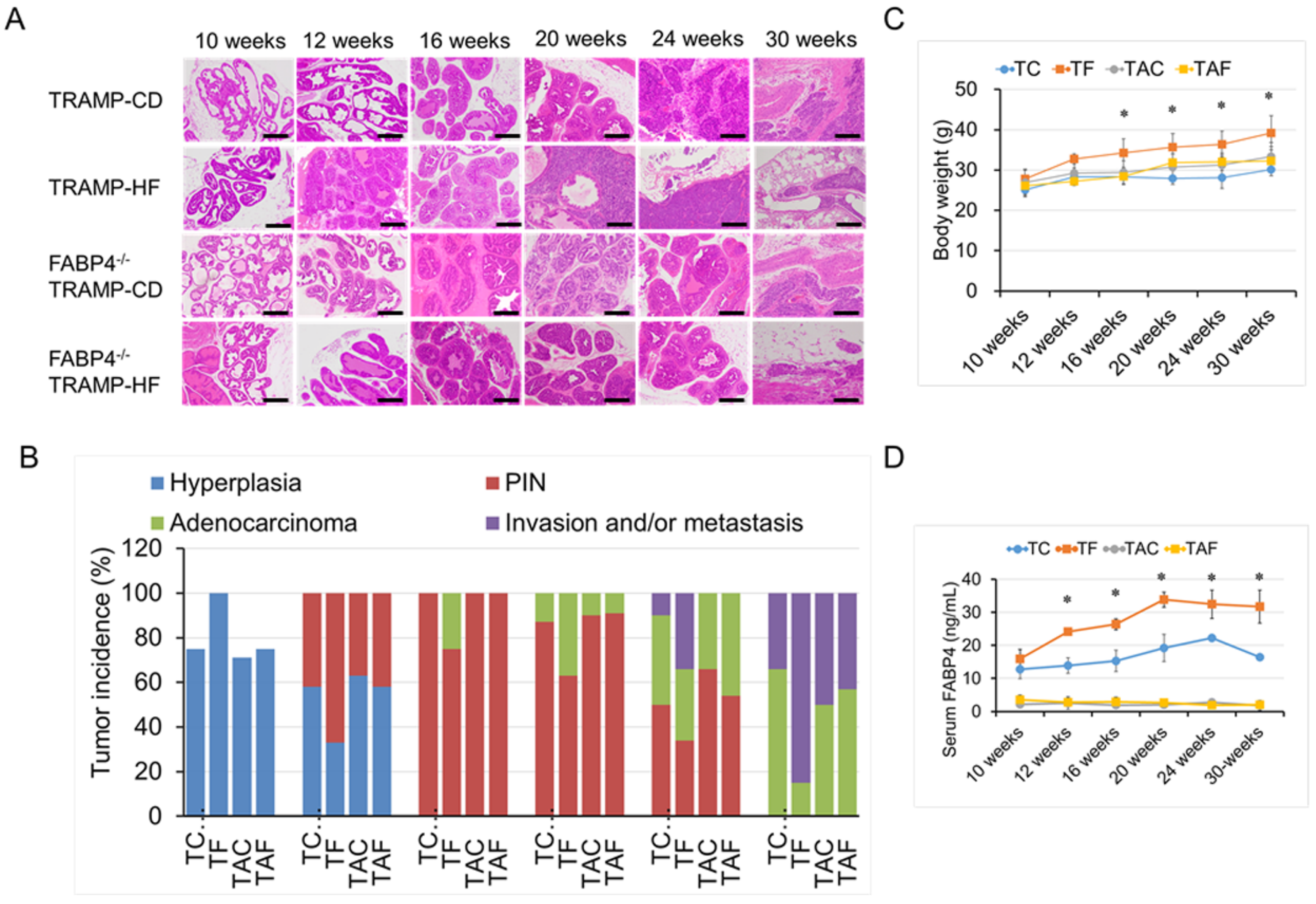 2.2. Loss of FABP4 Diminished HF-Mediated TRAMP Tumor Development and Progression