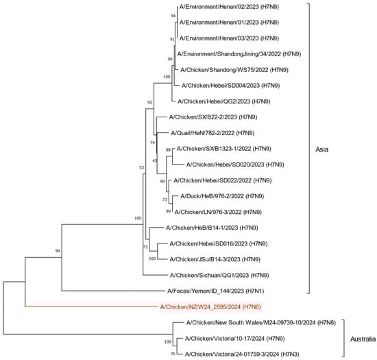 - McCulley, M.; Wilson, A.D.; Jauregui, R.; Gias, E.; Low, Y.S.; Ohneiser, S.; Stanislawek, W.; Bryant, L.; Chernyavtseva, A.; O’KEefe, J. High pathogenicity avian influenza (HPAI) H7N6 virus detected in New Zealand poultry. Genome Announc. 2025, 14, e0008825. [Google Scholar] [CrossRef] [PubMed]