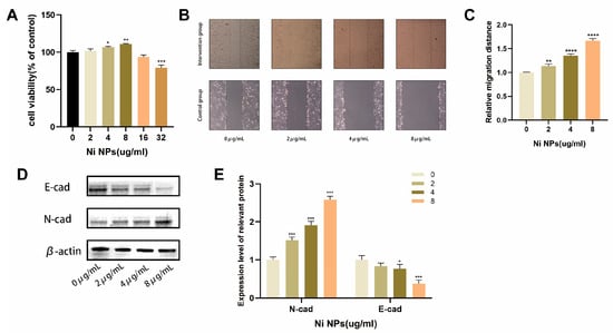 Proliferation, migration, and invasion of A549 cells exposed to NiNPs. (A) Cell viability at varying NiNPs doses; (B,C) cell migration; (D,E) expression of EMT markers (E-cadherin, N-cadherin). (* p < 0.05, ** p < 0.01, *** p < 0.005, **** p < 0.001 vs. 0 group).