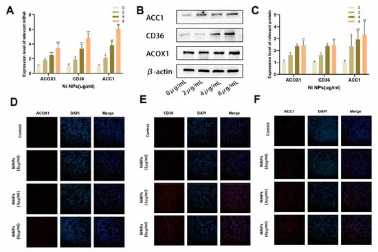 Detection of FAM-related genes/proteins in NiNP-exposed A549 cells. (A) FAM-related gene expression; (B,C) protein levels of ACOX1, CD36, ACC1; (D–F) immunofluorescence of ACOX1, CD36, ACC1 proteins. (* p < 0.05, ** p < 0.01, *** p < 0.005 vs. 0 group).