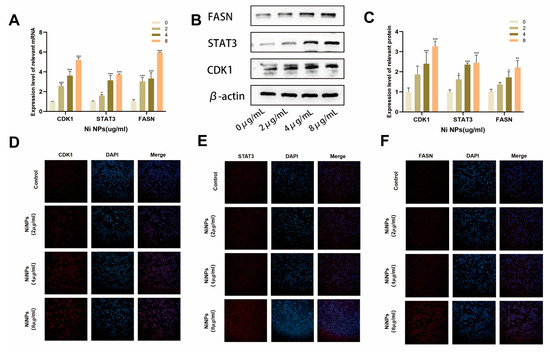 Detection of CDK1 pathway genes/proteins in NiNP-exposed A549 cells. (A) CDK1 pathway gene expression; (B,C) protein levels of CDK1, STAT3, FASN; (D–F) immunofluorescence of CDK1, STAT3, FASN proteins. (* p < 0.05, ** p < 0.01, *** p < 0.005 vs. 0 group).