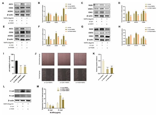 To investigate whether NiNPs affect FAM via CDK1, we silenced CDK1 in A549 cells using siRNA and exposed them to 8 μg/mL NiNPs. Protein levels of STAT3 and FASN were significantly reduced in CDK1-silenced cells (Figure 4A–D). Concurrently, the expression and functional states of key FAM-related proteins were restored to near-normal levels. These findings suggest that CDK1 mediates NiNP-induced FAM dysregulation by regulating downstream pathway molecules.