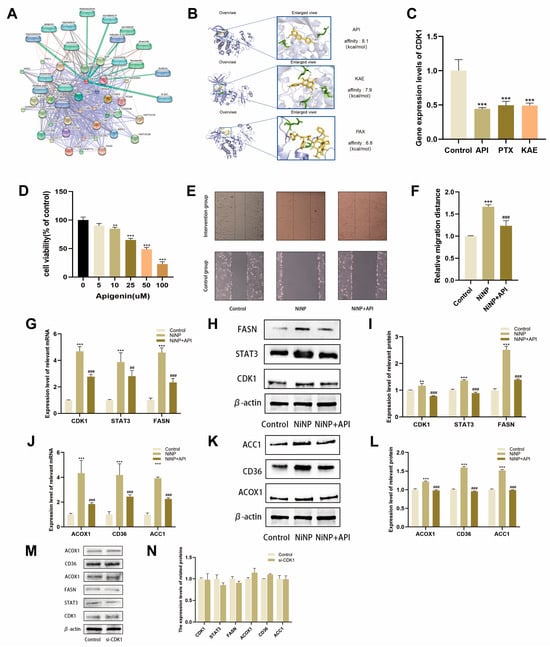 Effects of API on NiNP-induced FAM dysregulation. (A) Predicted CDK1 compound-protein interaction network; (B) affinity between CDK1 and plant-derived compounds; (C) CDK1 mRNA levels in A549 cells pretreated with plant-derived compounds; (D) cell viability after apigenin pretreatment + NiNP exposure; (E,F) migration levels of A549 cells; (G) expression of CDK1 pathway-related genes; (H,I) protein-level expression of CDK1 pathway components; (J) expression of FAM-associated genes; (K,L) protein-level expression of FAM-related markers; (M,N) impact of CDK1 silencing on API’s protective effects. (** p < 0.01, *** p < 0.005 vs. Control group. ## p < 0.01, ### p < 0.005 vs. NiNP group).