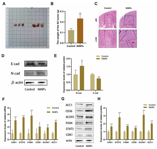 To further validate the results of the in vitro cell experiments, in this study, male C57BL/6 mice were used to establish a subcutaneous tumor xenograft model for in vivo research. During the seven-day acute and 28-day subacute exposure periods, general clinical signs of mice in each group were monitored daily, and no mouse deaths were observed. Mice in the NiNPs group exhibited significant abnormalities, while none were observed in the control group, specifically reduced spontaneous activity, dull hair, and greater weight loss in the NiNPs group. The results showed that, compared with the control group, the weights of the transplanted tumors in the mice of the group with acute NiNP exposure significantly increased (Figure 6A,B). In terms of histological analysis, the results of hematoxylin-eosin (HE) staining were also presented (Figure 6C). These results showed that the acute NiNP exposure group exhibited significant pathological alterations. Cells showed marked pleomorphism, hyperchromatic and irregular nuclei with increased mitotic figures, and disrupted architectural organization. The tumor parenchyma lost its regular glandular structures, with cells arranged in a disorganized, invasive pattern. In contrast, control group tissues displayed normal cellular morphology and well-preserved tissue architecture, with intact glandular arrangements and minimal atypia. Western blot analysis further showed a significant upregulation of EMT in tumors (Figure 6D,E).