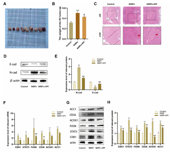 API reverses NiNP-induced tumor pathological changes and FAM abnormalities in mice. (A) Tumor morphology post-intervention. Left to right: control, NiNPs, NiNPs + API groups (3 mice/group, representative tumors); (B) tumor weight; (C) tumor organizational structure changes (red arrows indicate the NiNPs group has significant tissue lesions, while the NiNPs+API group shows marked improvement); (D,E) EMT-related protein expression in tumors; (F–H) expression of FAM-related and CDK1 pathway genes (F) and proteins (G,H) in tumors. (* p < 0.05, ** p < 0.01, *** p < 0.005 vs. Control group. # p < 0.05, ## p < 0.01, ### p < 0.005 vs. NiNP group).