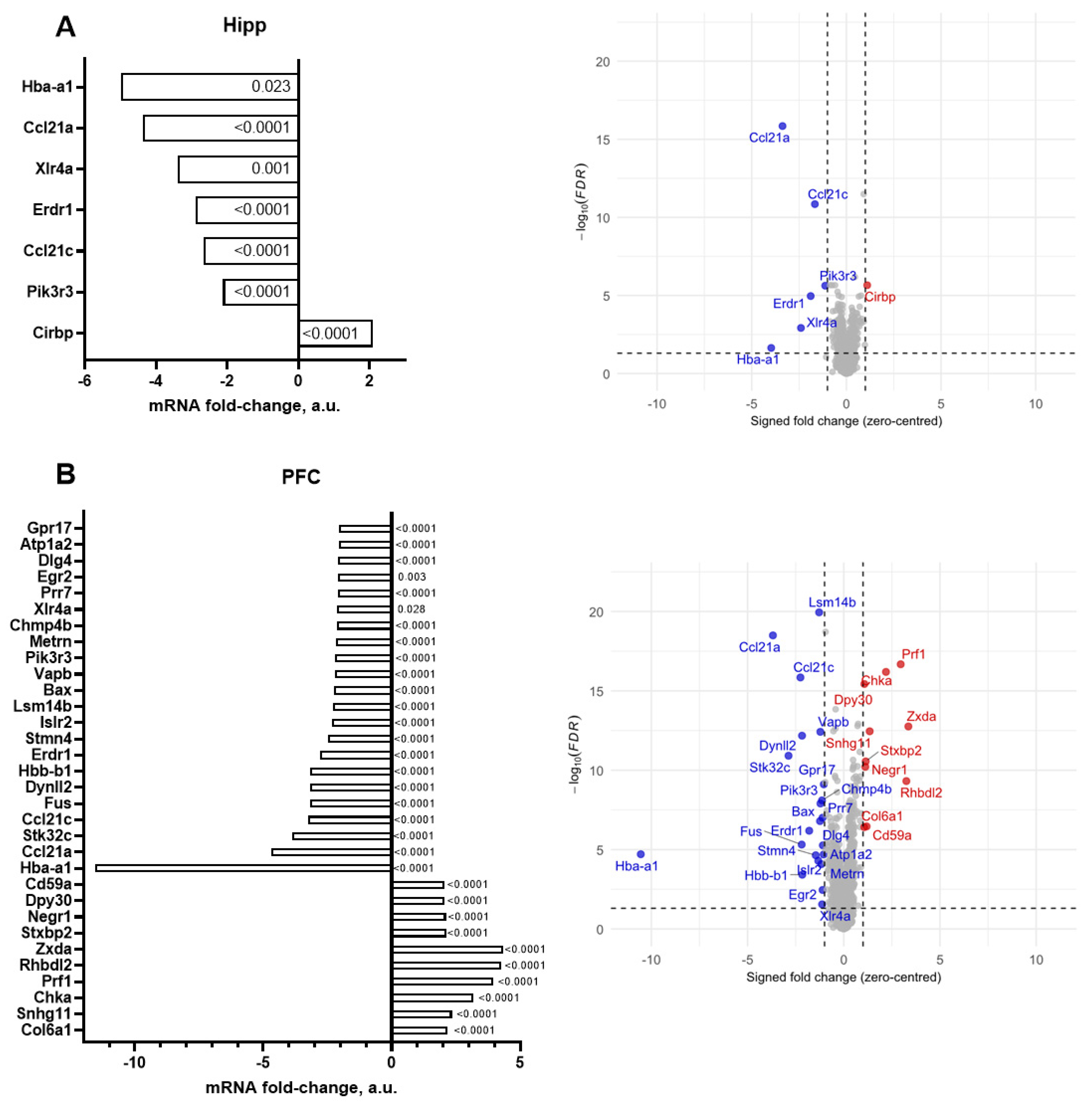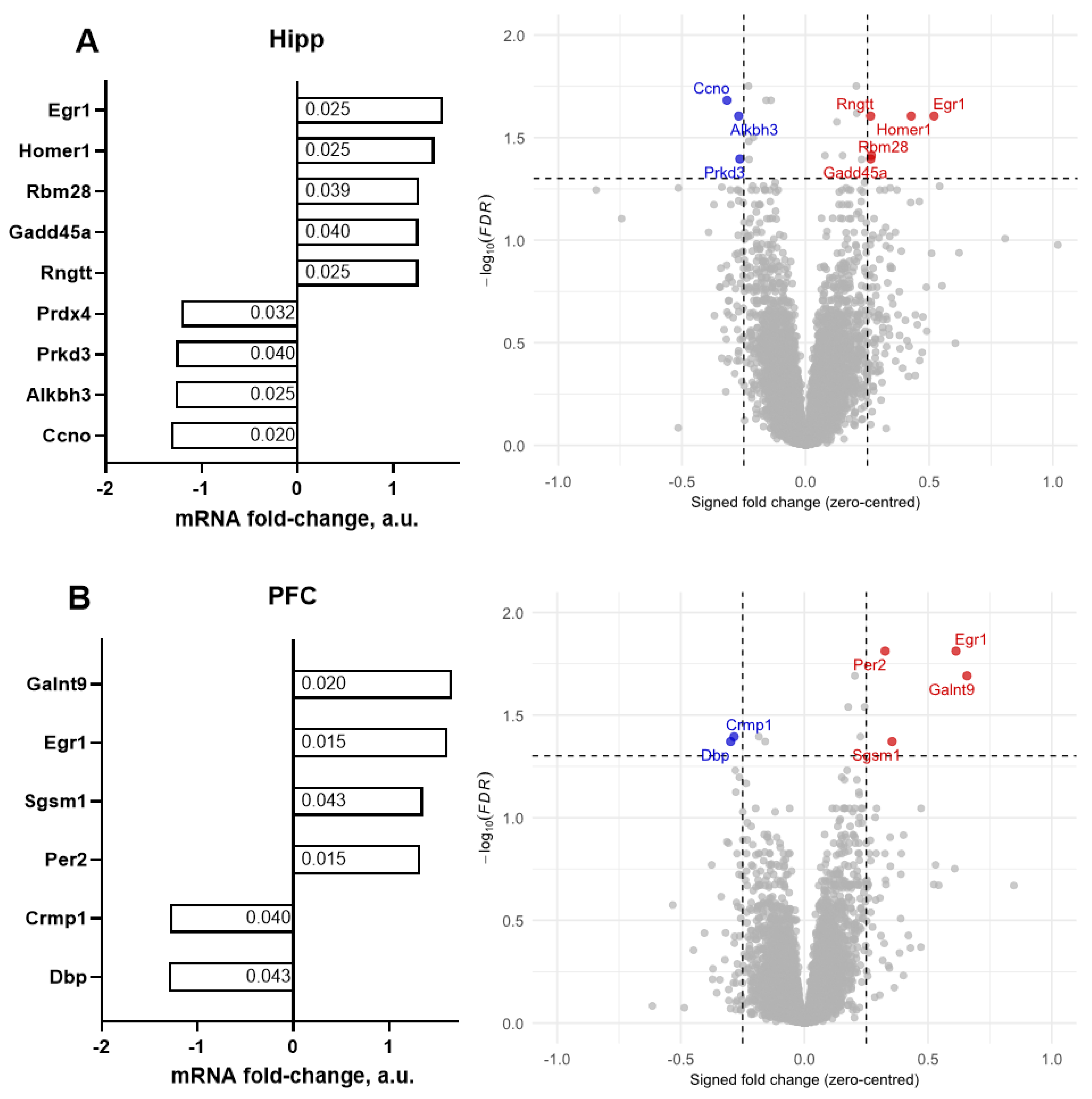 | Hippocampus | Prdx4, Prkd3, Alkbh3, Ccno, Egr1, Homer1, Rbm28, Gadd45a, Rngtt |
