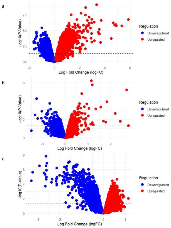 (a–c): Volcano Plots Showing Upregulated and Downregulated Genes in Acne Lesions and Following Short- and Long-Term Isotretinoin Treatment. (a) GSE6475: Acne lesions vs. normal skin; (b) GSE10433: Baseline vs. 1-week isotretinoin treatment; (c) GSE11792: Baseline vs. 8-week isotretinoin treatment).
