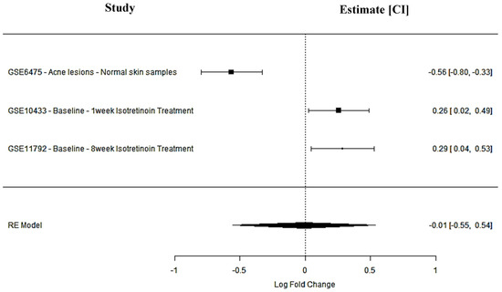 SPTBN1 encodes a cytoskeletal protein involved in cellular adhesion and membrane stability—key processes in maintaining skin barrier integrity and modulating inflammation. In acne lesions, SPTBN1 was significantly downregulated (GSE6475: logFC = −0.56; 95% CI: −0.80 to −0.33), suggesting a potential loss of structural regulation contributing to inflammatory pathogenesis. Following isotretinoin treatment, expression was upregulated both after 1 week (GSE10433: logFC = 0.26; 95% CI: 0.02 to 0.49) and 8 weeks (GSE11792: logFC = 0.29; 95% CI: 0.04 to 0.53). However, the random-effects model estimated a non-significant pooled effect size (logFC = −0.01; 95% CI: −0.55 to 0.54; p = 0.98), with high heterogeneity (I2 = 93.8%). Despite statistical variability, the consistent direction of upregulation post-treatment suggests that agonists of SPTBN1 may support cytoskeletal reorganization and barrier restoration, offering a potential anti-inflammatory strategy in acne drug development (Figure 2).