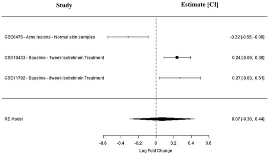 SIPA1L1 is involved in signal transduction pathways critical to immune regulation and cell adhesion. It was downregulated in acne lesions (GSE6475: logFC = −0.32; 95% CI: −0.55 to −0.08), indicating a suppression of immune signaling pathways. Post-isotretinoin treatment, SIPA1L1 was significantly upregulated in both short-term (GSE10433: logFC = 0.24; 95% CI: 0.09 to 0.39) and long-term (GSE11792: logFC = 0.27; 95% CI: 0.03 to 0.51) datasets. The pooled meta-analysis revealed a positive but non-significant effect (logFC = 0.07; 95% CI: −0.30 to 0.44; p = 0.71; I2 = 89.7%), reflecting inter-study variability. Nevertheless, the treatment-induced expression pattern supports SIPA1L1 as a candidate agonist target to enhance immune regulation and attenuate inflammation in acne-prone skin (Figure 3, Table 1).