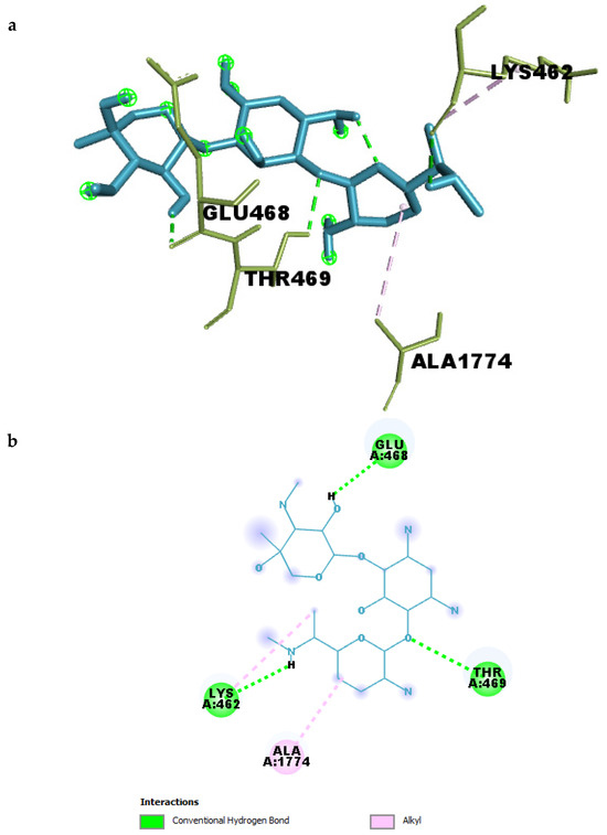 In addition to hydrogen bonding, hydrophobic interactions were identified between Gentamicin and ALA1774 and LYS462, both categorized as alkyl interactions, with distances ranging from 3.93 Å to 4.68 Å. These non-polar contacts may assist in optimizing ligand orientation within the pocket and contribute to the overall binding affinity.