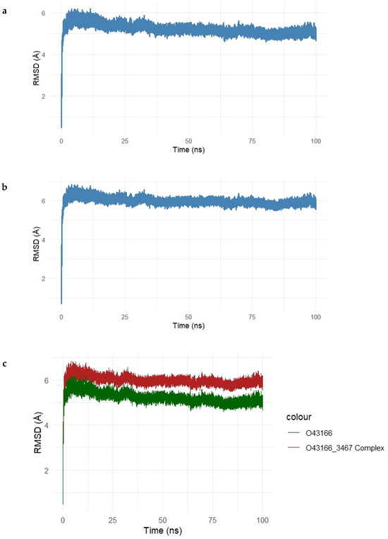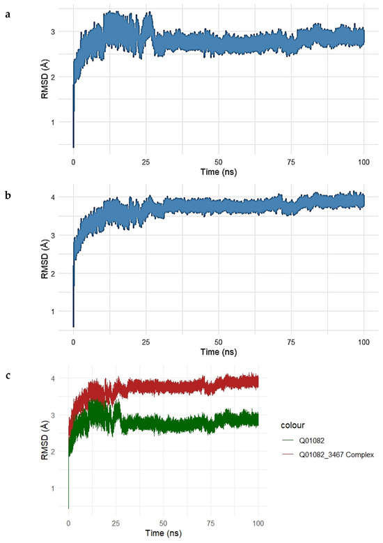 To assess the dynamic stability and conformational behavior of the Gentamicin–SPTBN1 complex, a 100 ns molecular dynamics simulation was performed. The root mean square deviation (RMSD) of the protein backbone and the protein–ligand complex was monitored over time to evaluate structural deviations and complex stability, as shown in Figure 7a–c.