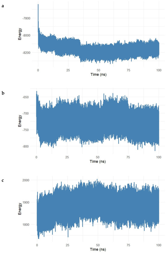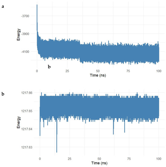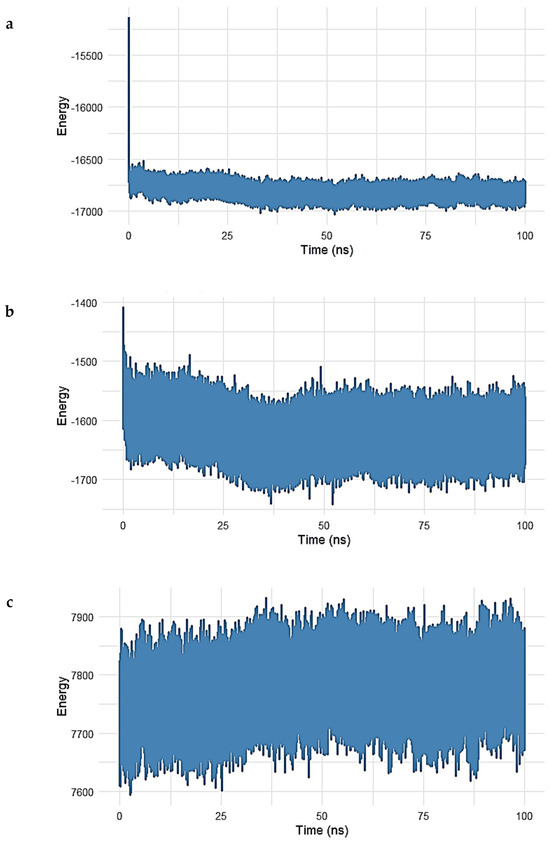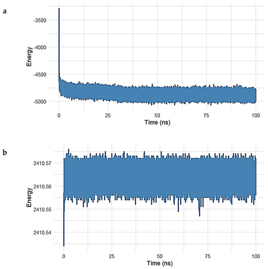The energetic stability of the Gentamicin–SPTBN1 complex was further evaluated by monitoring the potential and kinetic energy throughout the 100 ns molecular dynamics simulation. The energy profiles are presented in Figure 8a,b.