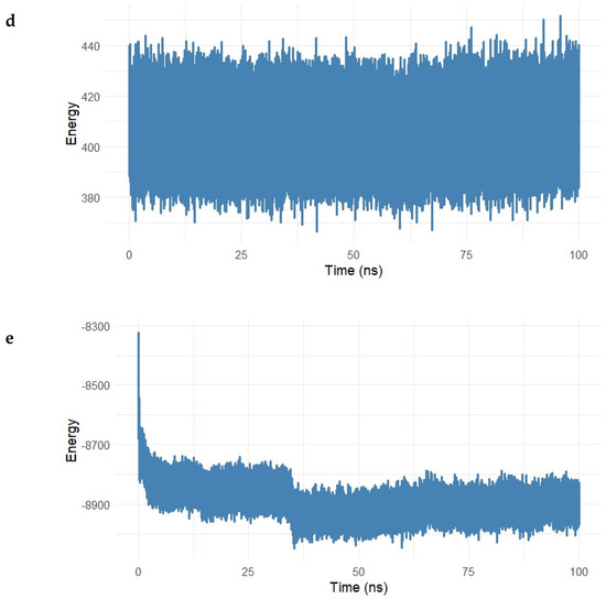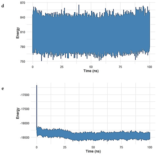 To evaluate the thermodynamic stability of the Gentamicin–SIPA1L1 complex, potential and kinetic energy profiles were analyzed throughout a 100 ns molecular dynamics simulation, as presented in Figure 13a,b.