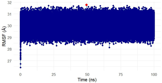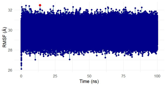 A single residue spike, marked in red on the plot, indicates a region with slightly elevated flexibility around the 50 ns mark. However, the deviation was marginal and did not impact the global structural stability of the complex. Such localized motion may reflect a surface loop or a solvent-exposed residue adapting to ligand binding but is not indicative of overall instability.