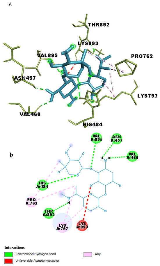 (a) 3D and (b) 2D interaction of Gentamicin within the binding pocket of SPTBN1.