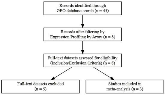 To identify relevant gene expression studies exploring the effects of isotretinoin in Acne Vulgaris, a systematic search was performed in the NCBI Gene Expression Omnibus (GEO) database. The search strategy employed the following query: (“Acne Vulgaris” [MeSH Terms] OR Acne Vulgaris [All Fields]) AND (“isotretinoin” [MeSH Terms] OR isotretinoin [All Fields]). This search yielded a total of 45 records.