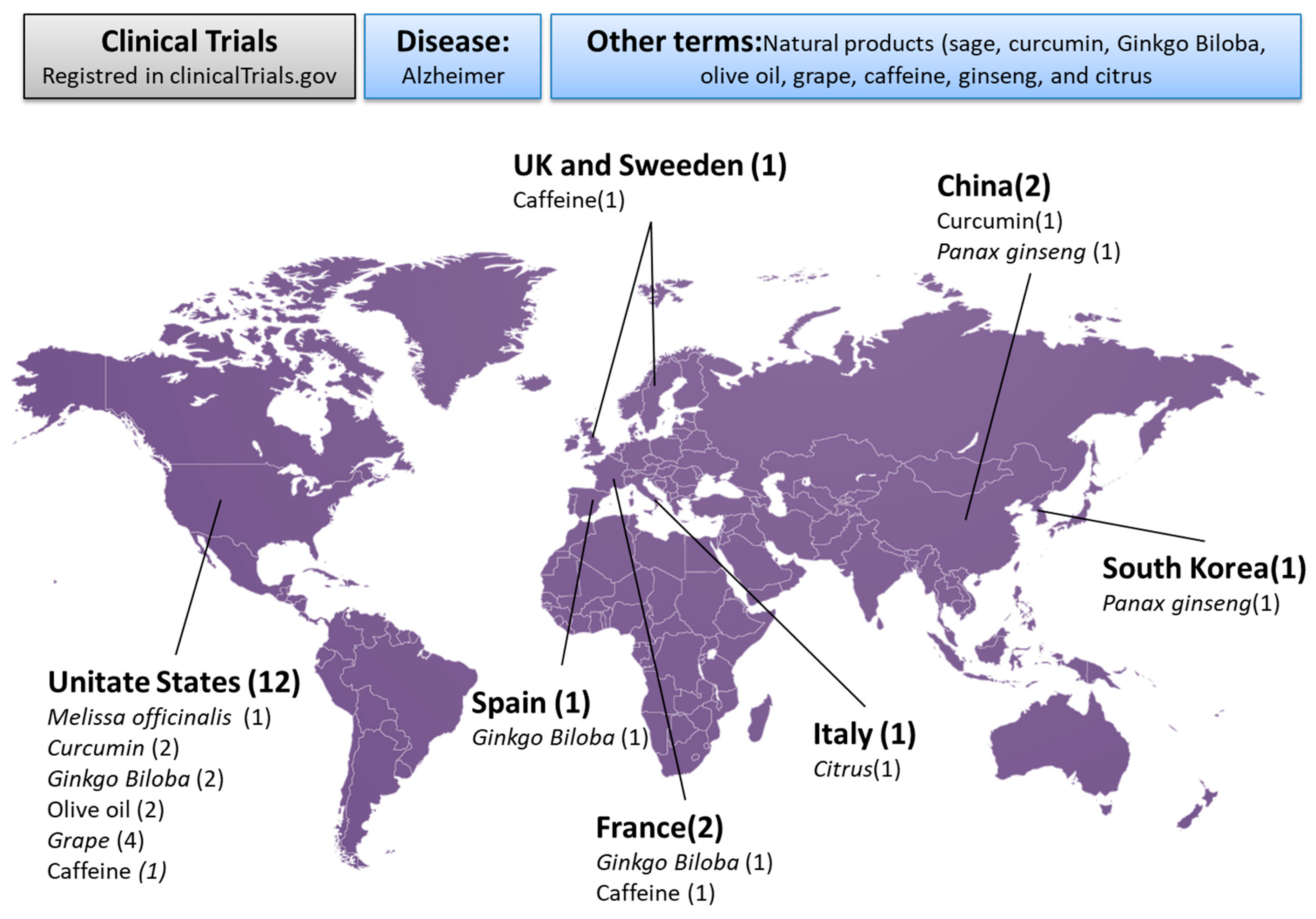 | 03221894 | AD. | One capsule/day in 150 mL warm water: 10 g ginseng, 30 g Rehmannia glutinosa, 10 g Acorus tatarinowii, 10 g Polygala tenuifolia, 10 g Epimedium brevicornu, 10 g Cornus officinalis, 10 g Cistanche deserticola, 10 g Curcuma aromatic, 10 g Salvia miltiorrhiza, 10 g Angelica sinensis, 10 g Gastrodia elata, and 10 g Berberine. | -MMSE. -ADCS-ADL. -CDR. | 120 subjects (50–85 years old, all genders, no healthy volunteers). | Beijing, China. | Not applicable. | Not provided. |