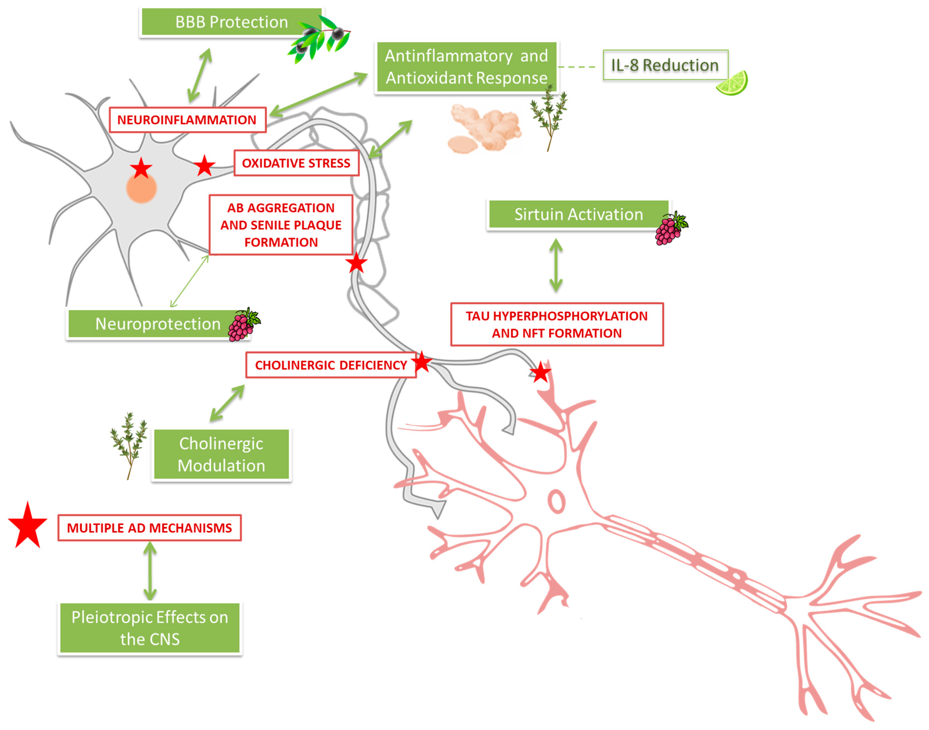 | BBB integrity | Extra virgin olive oil, Resveratrol | Cytokine-induced BBB disruption | NCT03824197, NCT1504854 |