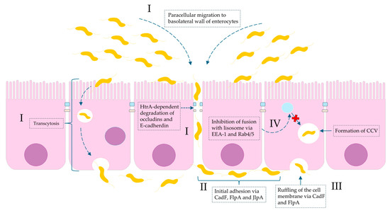 Molecular basis of Campylobacter spp. invasion of intestinal mucosa with regard to virulence factors. (I): invasion is a consequence of both paracellular cell migration to the basolateral side of the enterocyte via modifying fibronectin molecules and degradation of tight junctions (occludins and claudins) by HtrA protease and transcytosis (transfer from apical to basal part of enterocyte). (II): The initial adhesion of Campylobacter spp. to outer membrane proteins (OMPs) of the basolateral membrane of intestinal cells is due to bacterial proteins: CadF (fibronectin-binding protein), FlpA (fibronectin-like protein A), and JlpA (jejuni lipoprotein A-binding protein Hsp90). (III): The interaction of CadF and FlpA with fibronectin induces the remodeling of the actin cytoskeleton and leads to ruffling of the cell membrane. (IV): The intercellular survival of Campylobacter spp. cells inside infected cells are a result of the formation so-called CCV (Campylobacter-containing vacuole). The molecular interference with EEA-1 (early endosomal agent 1) and GTPases Rab4/5 leads to avoidance of vacuole-lysosome fusion.