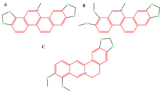 According to the data provided by the manufacturer, they presented the following purity (HPLC): berberine, BBR (5,6-dihydo-9,10-dimethoxybenzo[g]-1,3-benzodioxdo[5,6-a] qlinolizinium): 97%; chelerythrine, CHE (1,2-dimethoxy-12-methyl-[1,3]dioxolo [4′,5′:4,5]benzo[1,2-c]phenanthridin-12-ium): 98%; and sanguinarine, SAN (13-methyl-[1,3]benzodioxdo[5,6-c]-1,3-dioxdo[4,5-i]phenanthridinium): min. 95%.