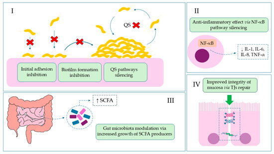 The role of BBR in invasive gastrointestinal infections. (I): Reduction of colonization, the first stage of infection, by blocking adhesive particles and stabilizing the epithelial barrier, which leads to inhibition of biofilm formation, quorum sensing (QS), and DNA synthesis; Red Cross—location of action/inhibition. (II): Reduction of inflammation and diarrhea symptoms by inhibiting NF-κB and lowering pro-inflammatory cytokine levels; (III): Restoration of intestinal balance by modulating the microbiota and increasing SCFA (short-chain fatty acids) bacteria; (IV): Reduction of systemic symptoms by strengthening the intestinal barrier.