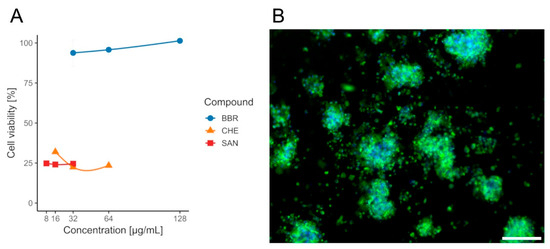 Viability of CCD841 CoN cells after 24 h exposure to isoquinoline alkaloids measured by the MTT assay. (A)—bars/points show mean ± SD (n = 4 per concentration). Concentrations: BBR 32/64/128 µg/mL (blue), CHE 16/32/64 µg/mL (orange), SAN 8/16/32 µg/mL (red). Within each compound, differences among concentrations were not significant. BBR yielded higher viability than CHE and SAN, whereas CHE vs. SAN were not different. (B)—the effect of BBR on colonocytes. Sample stained with FM 1–43 (green) and DAPI (blue) to visualize cell membranes and nuclei, respectively. Scale bar, 80 µm.