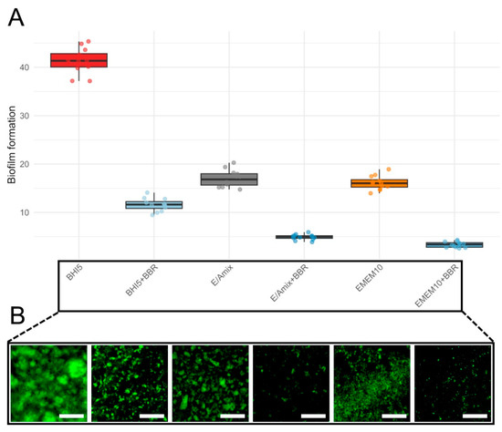 Biofilm formation across culture conditions. (A)—boxplots show the distribution of biofilm levels for six conditions: BHI5 (red), BHI5 + BBR (light blue), EMEM10 (orange), EMEM10 + BBR (medium blue), E/Amix (grey), and E/Amix + BBR (dark blue). Boxes indicate the IQR, center line the median, whiskers 1.5 × IQR; points are individual measurements. (B)—effect of BBR on biofilm formation under the experimental conditions corresponding to those shown in panel (A). Samples were stained with rabbit polyclonal anti-C. jejuni antibodies conjugated to FITC (dilution 1:10). Scale bar, 60 μm.