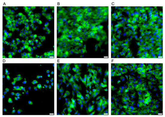 Morphology of the CCD841 CoN cell line. Panels (A–C) present cell growth in E/Amix medium after 24 h, 48 h, and 96 h, respectively, while (D–F) show cell growth in EMEM10 medium after 24 h, 48 h, and 96 h, respectively. Sample stained with FM 1–43 (green) and DAPI (blue) to visualize the cell membrane and nucleus, respectively Scale bars, 20 µm.