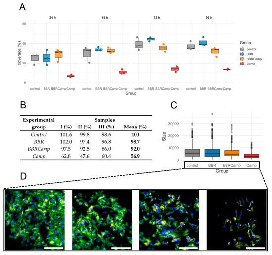 Epithelial monolayer surface coverage (%) over time under four conditions. (A)—boxplots with overlaid points show the distribution of measurements at 24 h, 48 h, 72 h, and 96 h for control (grey), BBR (blue), BBRCamp (orange; BBR + C. jejuni supernatant), and Camp (red; C. jejuni supernatant). Each point is an individual observation; boxes indicate the interquartile range (IQR), the center line is the median, and whiskers extend to 1.5 × IQR. The y-axis (0–60%) is shared across panels. (B)—table comparing epithelial monolayer surface coverage (%) from three repetitions at the time point of 96 h. (C)—boxplots display the distribution of cell sizes for the four experimental groups. Dots represent individual outliers and other plot elements are as described for panel (A). (D)—Morphology change of the tested colonocyte line and appearance of the monolayer under experimental conditions corresponding to, from left to right: control, BBR, BBRCamp (BBR + C. jejuni supernatant), and Camp (C. jejuni supernatant). Samples were stained with FM 1–43 (green), DAPI (blue) and anti-ocludin antibodies (red) to visualize the cell membrane and nucleus, respectively. Scale bar, 120 µm.