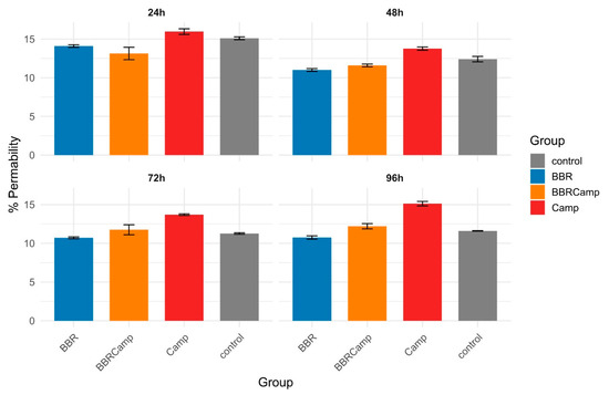 The Lucifer yellow assay confirmed that C. jejuni significantly weakens tight junctions (TJ) between colonocytes. In our studies, we observed that the tested strain affected TJ already on the first day of the in vitro infection model. The impact on colonocytes increased slightly over time, ranging from 13.8 ± 0.21% at 48 h to 15.1 ± 0.29% at 96 h (Figure 9, Table S11). In contrast, BBR showed a permeability level of approximately 11% throughout the experiment, comparable to that in the untreated control. Notably, BBR alone had a protective effect on tight junctions compared to the control (Wilcoxon, p(Bonf) < 0.05, Table S12), while the combination of BBR and C. jejuni supernatant (BBRCamp) is consistently lower than the C. jejuni supernatant alone (Camp; Wilcoxon, p(Bonf) < 0.05, Table S12) and became indistinguishable from the control at 72–96 h. This indicates a protective, intestinal barrier-stabilizing effect of BBR in an in vitro model of campylobacteriosis.