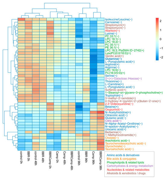 Heat map of 47 metabolites that changed significantly across all groups. Values are protein-normalized, log2-transformed means, and are row-scaled (Z-scores). Rows and columns are hierarchically clustered (Euclidean distance). Warmer colors indicate higher relative abundance and cooler colors lower. Columns are ordered by condition and time (control, BBR, Camp, BBRCamp at 0, 48, and 96 h). The maps reveal a clear structure by condition/time, with Camp at later times separating most strongly, while BBR and BBRCamp tend to cluster closer to the control.