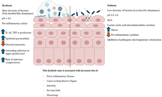 Cervicovaginal dysbiosis and eubiosis. The right side illustrates a healthy cervicovaginal epithelium, characterized by Lactobacillus spp. dominance, which helps maintain an acidic pH, produce protective metabolites (e.g., lactic acid and hydrogen peroxide), increase mucus production, reinforce epithelial barrier integrity, and modulate immune homeostasis. On the left, dysbiosis is depicted, marked by the depletion of Lactobacillus spp. and overgrowth of anaerobic bacteria, such as Gardnerella, Prevotella, and Atopobium. This microbial imbalance leads to elevated pH, epithelial barrier disruption, and increased expression of pro-inflammatory cytokines (e.g., IL-1β, TNF-α), r resulting in mucosal inflammation and microbial ascension to the upper genital tract. These mechanisms contribute to increased susceptibility to STIs, such as CT infection and its complications, including pelvic inflammatory disease (PID), miscarriage, preterm birth, infertility, and gynecological cancers [50,56]. The central vertical line indicates the conceptual boundary between dysbiotic and eubiotic states. Figure created using BioRender—https://www.biorender.com/ (accessed on 30 June 2025).