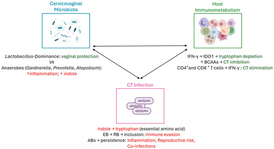 Interplay between vaginal microbiota, host immunometabolism, and Chlamydia trachomatis infection. CD4+ helper T-cells and CD8+ cytotoxic T-cells are responsible for CT clearance [67,68,69,70]. Additionally, a Lactobacillus-dominated vaginal microbiota contributes to mucosal homeostasis by maintaining epithelial integrity, modulating local immune responses, and limiting pathogen colonization [50]. In contrast, anaerobic bacteria can increase local inflammation and indole production, creating a favorable environment for CT infection [60,61]. Indole could be used by CT to synthesize tryptophan, an essential amino acid for its growth [71,72,73,74]. Also, thanks to its biphasic cell cycle, the conversion of infectious elementary bodies (EBs) into replicative reticulate bodies (RBs) within the inclusion enables immune evasion [14,63]. Under unfavorable conditions, CT can convert into aberrant bodies (ABs), leading to persistent infection, chronic inflammation, reproductive complications, and increased risk of co-infections [71]. Host immunometabolic factors, including IFN-γ–mediated tryptophan depletion and branched-chain amino acid (BCAA) signaling, interact with microbial metabolites to influence CT infection outcomes [75,76,77,78,79,80]. Figure created using BioRender—https://www.biorender.com/ (accessed on 20 October 2025).