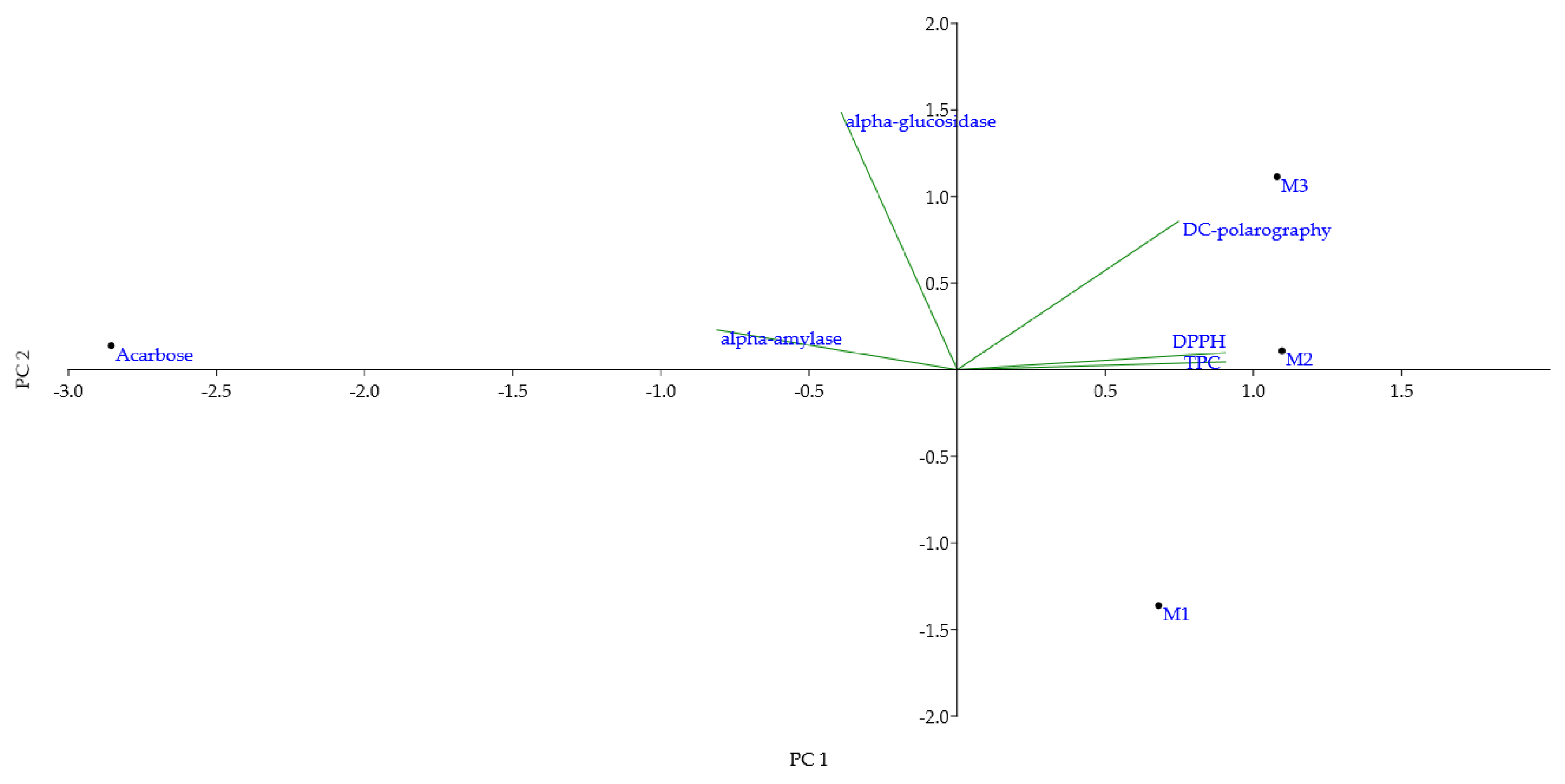 - Selim, D.A.; Eldin, S.M.S.; González, F.P.; Ghareeb, D.A.; Shawky, E. Metabolomics and chemometrics-driven valorisation of mango leaves: Unveiling putative α-amylase and α-glycosidase inhibitory metabolites. Food Biosci. 2024, 61, 104652. [Google Scholar] [CrossRef]