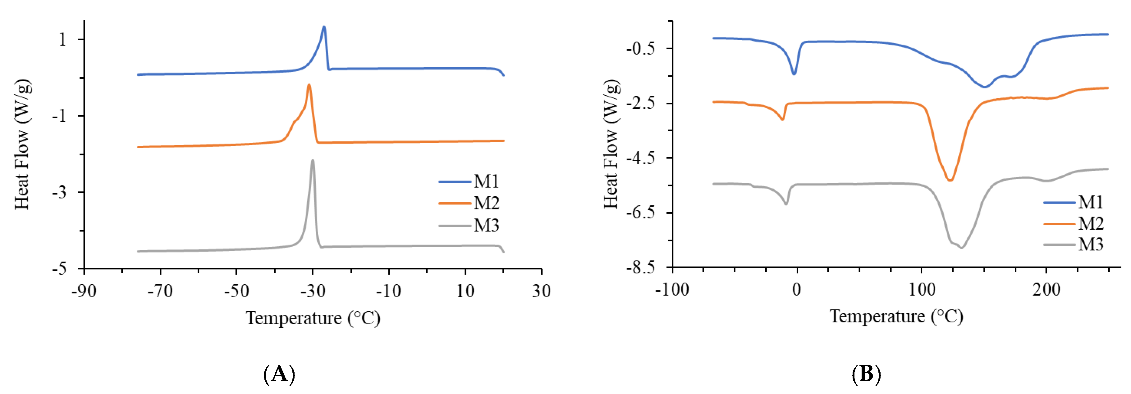 | Ton (°C) | Tp (°C) | Tend (°C) | ΔH (J/g) | Ton (°C) | Tp (°C) | Tend (°C) | ΔH (J/g) | Ton (°C) | Tp1 (°C) | Tp2 (°C) | Tp3 (°C) | Tend (°C) | ΔH (J/g) | |