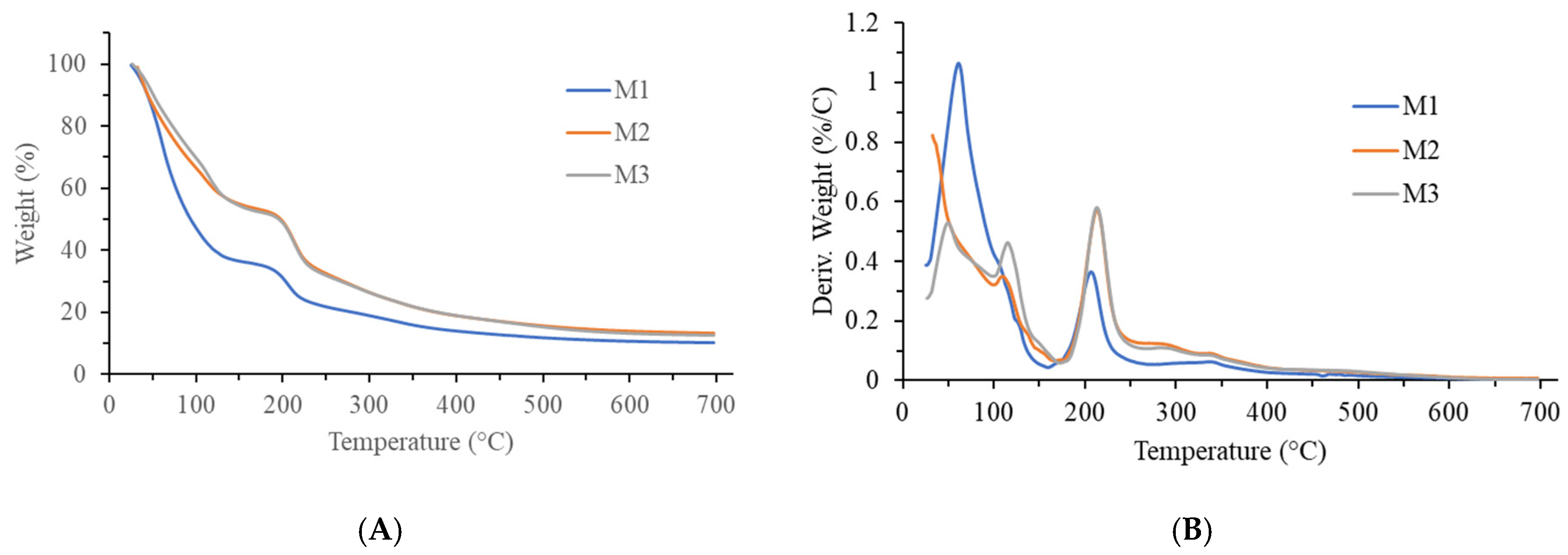 | Sample | WL1 (%) | Ts (°C) | Tp1 (°C) | Tp2 (°C) | Te (°C) | WL2 (%) | Ts (°C) | Tp (°C) | Te (°C) | Res at 700 °C (%) | ||||