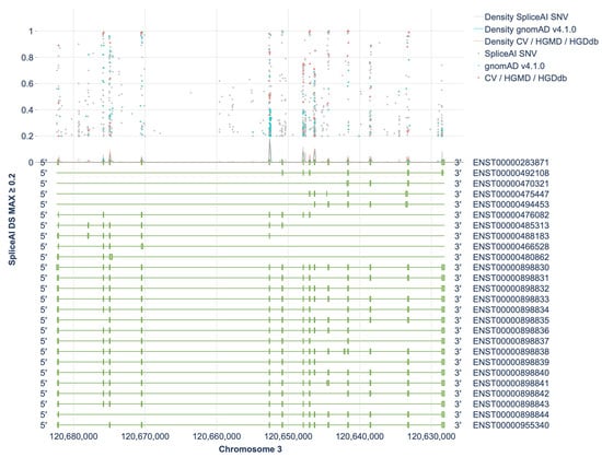 Pre-mRNA splicing is an essential step in transcript processing, carried out by the spliceosome—a complex of small nuclear ribonucleoproteins and auxiliary splicing factors that recognize cis-elements on the nascent transcript, including the 5′ and 3′ splice sites, the branchpoint, and the polypyrimidine tract [9]. Variants within these elements may be splice-disrupting, leading to the production of aberrant transcripts and disease [10].