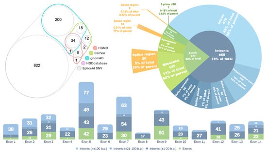 The majority of spliceogenic variants (855, or 78%) are located within intronic regions, while 243 (22%) reside in exons. Among the intronic variants, 476 (56%) are classified as deep intronic, located outside canonical splice site elements. The remaining 44% are situated within defined splice site regions (Figure 2, right panel).