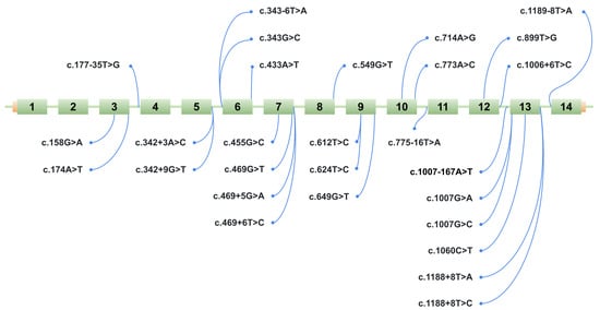 Schematic representation of the location of 28 potentially splice-disruptive variants in the HGD gene. The figure shows a schematic of the ManeSelect transcript of the HGD gene—NM_000187.4/ENST00000283871.10—including all 14 exons (numbered 1 to 14), along with the positions of the studied variants relative to the transcript.