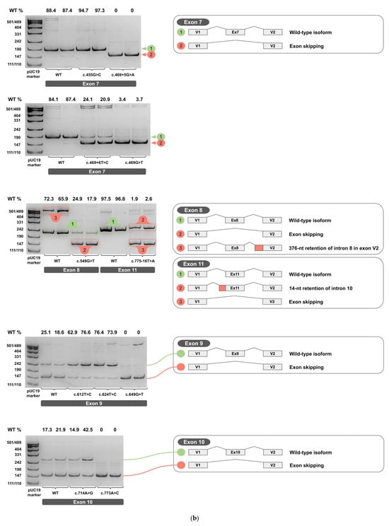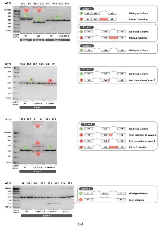 Each minigene construct was tested in two independent biological replicates. The total RNA was extracted, reverse-transcribed into cDNA, and each cDNA replicate was PCR-amplified. Amplicons from cDNA of wild-type and variant minigenes were resolved on 4.5% PAGE and are shown in Figure 4a–c for two biological replicates (original, uncropped, and unadjusted electrophoretic gel images are provided in Supplementary S3).