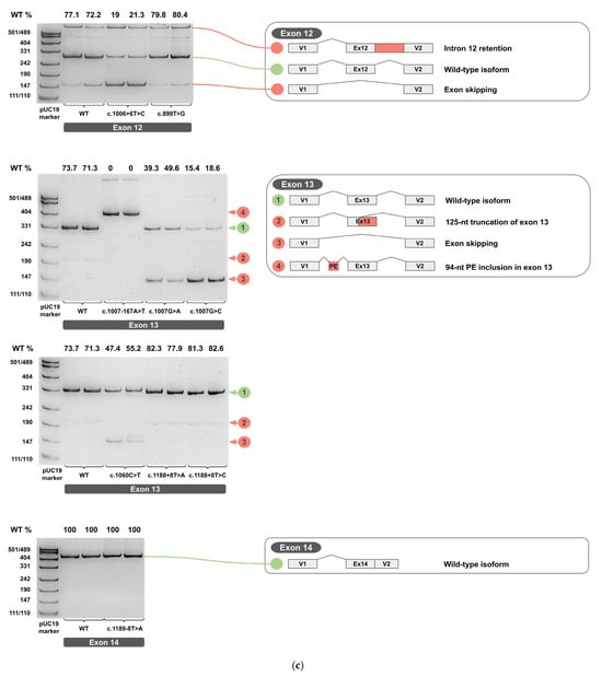 cDNA PCR products from two biological replicates visualized on 4.5% PAGE, with schematic diagrams of transcript isoforms. Green indicates wild-type isoforms, red indicates aberrant isoforms. The percentage of the wild-type isoform is shown above each band. (a) Exons 1-6. (b) Exons 7-11. (c) Exons 12-14.