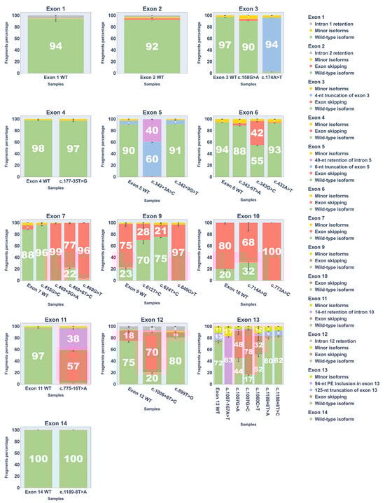To quantify splicing outcomes, each cDNA replicate was PCR-amplified with fluorescent primers for fragment analysis. Results are shown in Figure 5 and Supplementary S7 (fragment analysis chromatograms are provided in Supplementary S2).