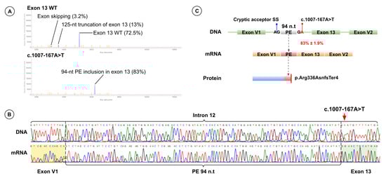 Functional Analysis Results for Variant c.1007-167A>T. (A) Fragment analysis of cDNA from minigenes harboring the wild-type exon 13 sequence (top) and the exon 13 sequence with c.1007-167A>T (bottom). (B) Sanger sequencing results of patient genomic DNA (top) harboring c.1007-167A>T (red arrow) and of cDNA from the minigene harboring the exon 13 sequence with c.1007-167A>T (bottom). (C) Schematic representation of the splicing effect induced by c.1007-167A>T.