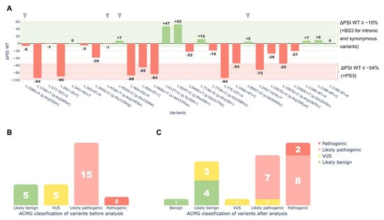 Functional analysis of 27 HGD variants using the minigene splicing assay. (A)—ΔPSI WT values showing changes in the wild-type transcript isoform for each variant. The red area (ΔPSI WT ≤ 54%) marks the cutoff where all variants were assigned the PS3 criterion. The green area (ΔPSI WT ≥ −10%) marks the cutoff where intronic and synonymous variants were assigned the BS3 criterion. For missense and nonsense variants, BS3 was not applied, even though they showed no significant effect on splicing (gray arrows). These variants may cause pathogenic effects unrelated to splicing. (B)—ACMG classification of variants before the minigene splicing assay. (C)—ACMG classification of variants after the minigene splicing assay. The X-axis shows the classification after analysis. Bar values and colors indicate the classification before the assay, illustrating reclassification.