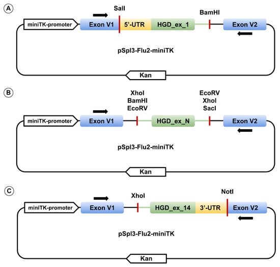 Each of the 14 wild-type HGD exons, together with ≥ 90 bp of flanking intronic sequence (with 5′ and 3′ UTR replacing intronic regions for the first and last exons, respectively), was PCR-amplified from human genomic DNA using HS-Fuzz DNA polymerase (Dialat, Moscow, Russia). Primers incorporated restriction sites for SalI, BamHI, XhoI, EcoRV, NotI, or SacI restriction enzymes. Amplified fragments were cloned into the multiple cloning site between two constitutively spliced exons of the pSpl3_Flu2-miniTK vector (Figure 8). pSpl3-Flu2-miniTK is a modification of pSpl3-Flu in which the CMV promoter was replaced with the HSV-TK mini promoter (–33 to +32 region of the herpes simplex virus thymidine kinase promoter) and the strong cryptic splice site downstream of the MCS was deleted [31,32]. Single-nucleotide variants were introduced via site-directed mutagenesis. All constructs were verified by Sanger sequencing using primers pSpl3_F and pSpl3-Flu2R for exons 2–13, TurboFP_F and pSpl3-Flu2R for exon 1, and pSpl3_F and EGFP_R3I for exon 14 (primer sequences for genomic amplification, mutagenesis, and plasmid sequencing are listed in Supplementary Table S1).